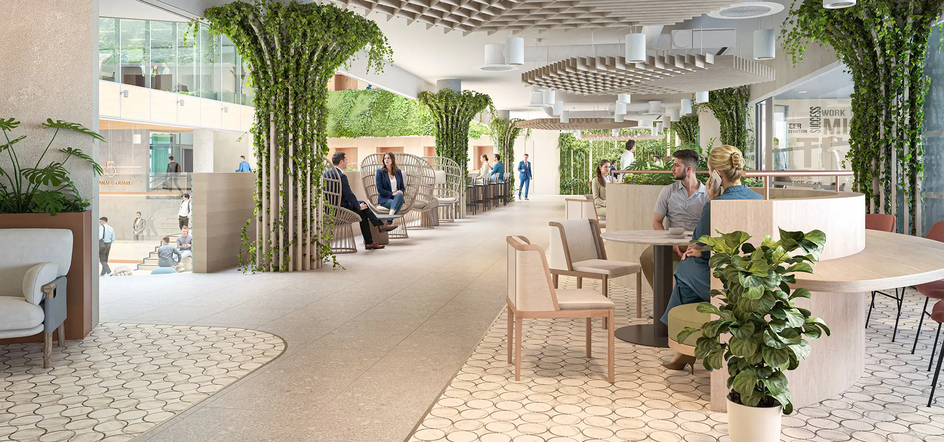 The central Town Hall atrium is a bright, open space designed to encourage interaction, team connection and shared energy. Also featuring breakout spaces and rooftop terraces, the building is designed to spark ideas and support modern, flexible working.