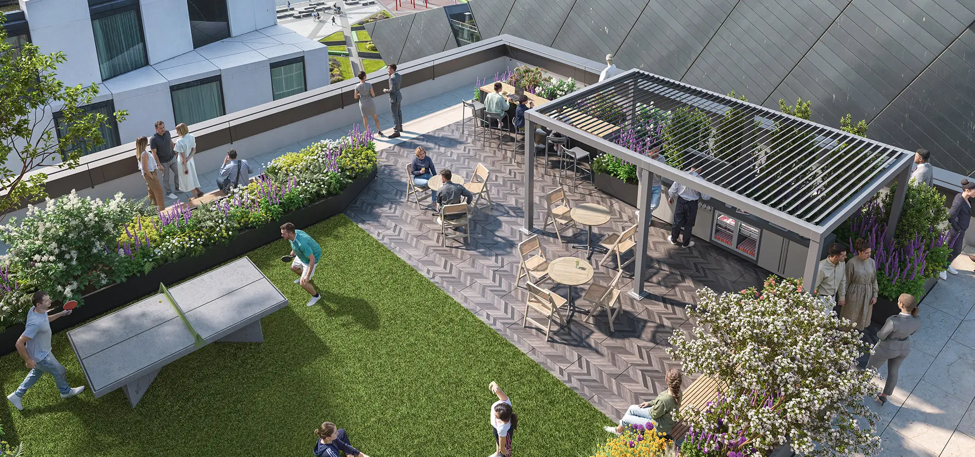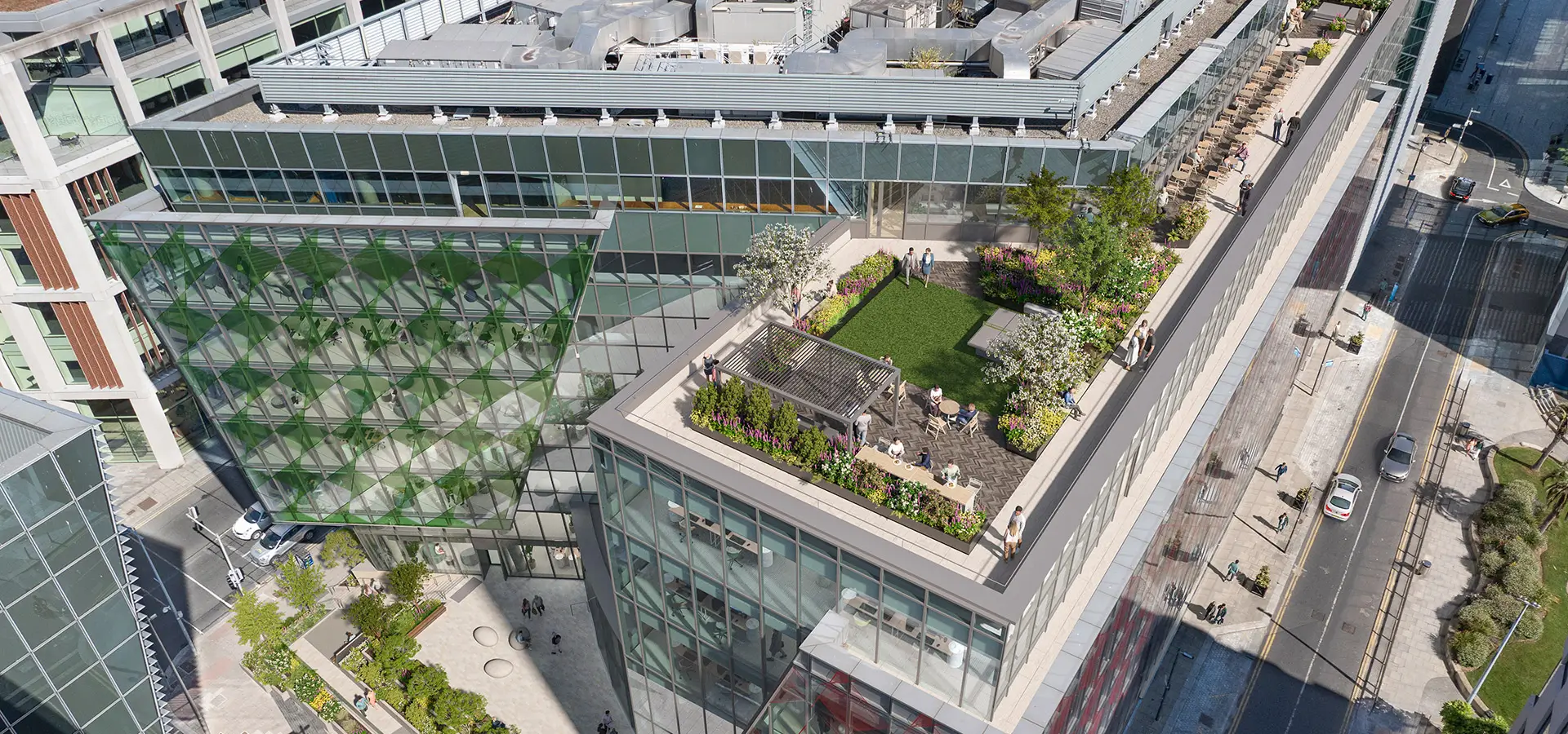four&five Grand Canal Square features a landscaped public realm at street level and a terraced rooftop garden above.